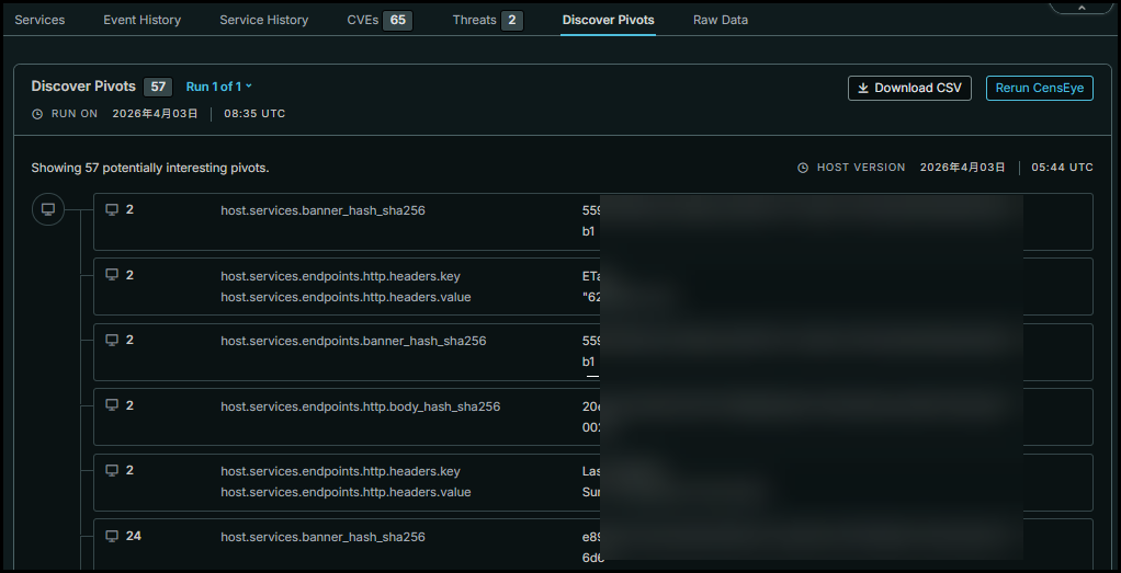 CensEyeを使用し、証明書やJARMなどの属性をもとに関連するホストへピボットする処理です。