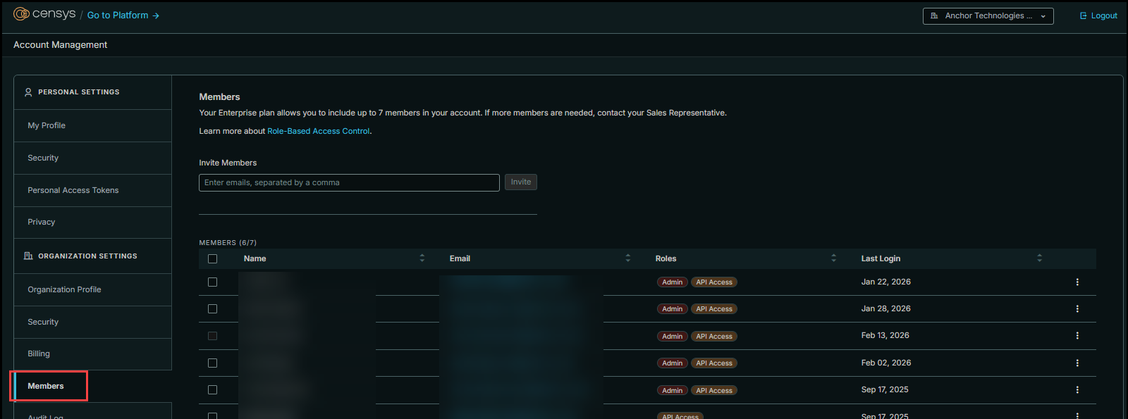 Censysでは、「Organization Settings」内の「Members」ページから、組織に所属するユーザーの管理を行います。