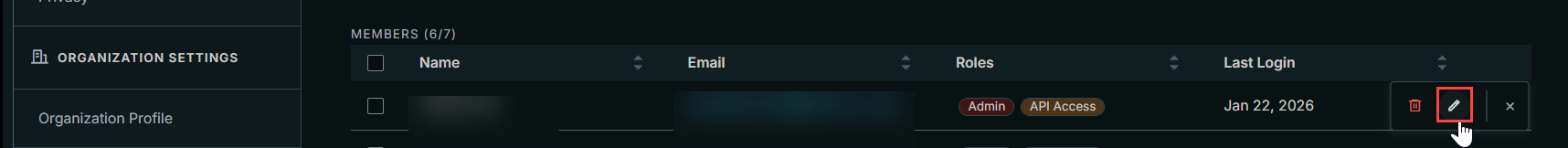 管理者(Admin)権限を持つユーザーは、「Members」ページから各ユーザーのロール(Member/Admin)およびAPIアクセス権限を変更できます。