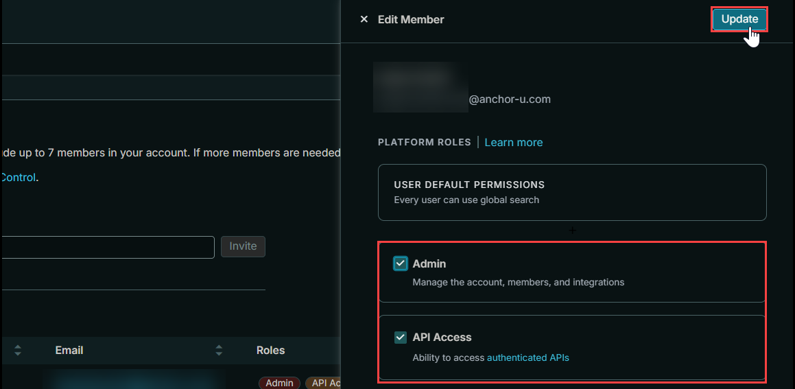 - ロール(Member/Admin)およびAPIアクセス権限を設定し、右上の「Update」をクリックして変更内容を保存します。