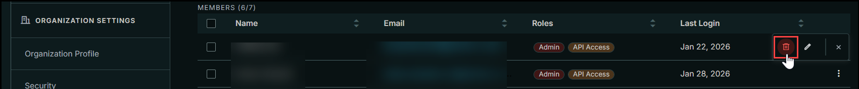 退職や異動などによりアクセスが不要になった場合は、「Members」ページよりユーザーを組織から削除できます。