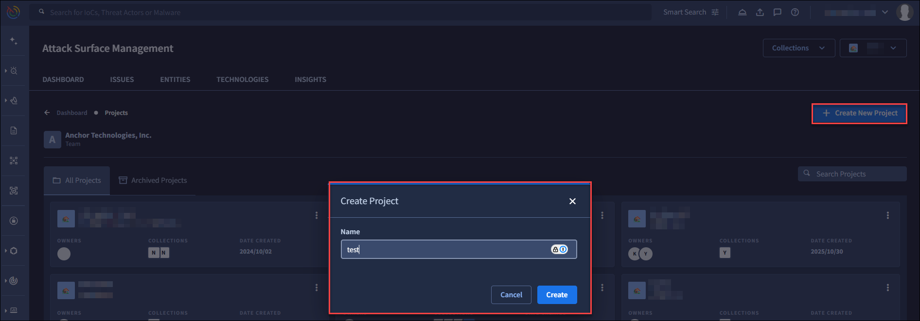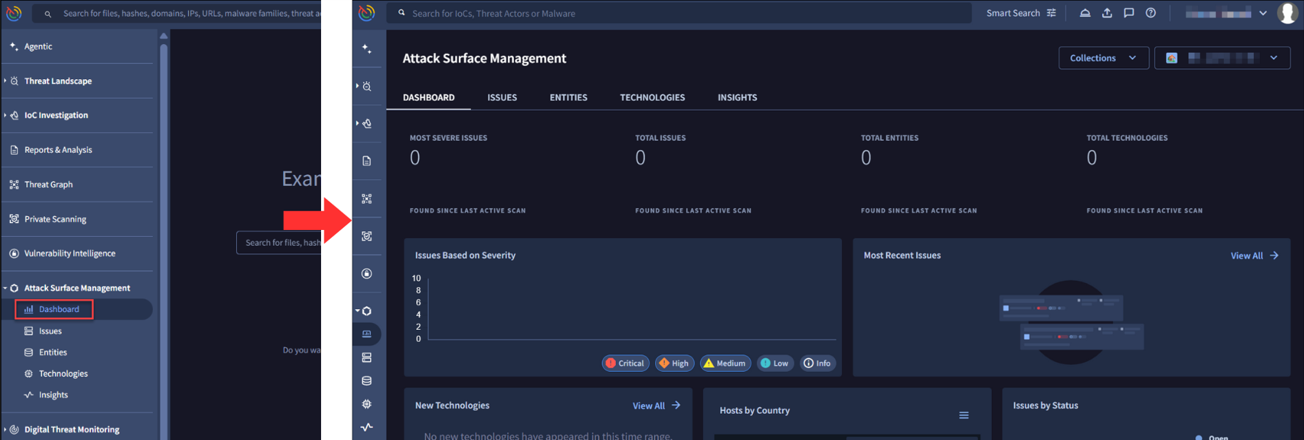 Google threat intelligenceにログインし、画面左側のメニューバーから、「Attack Surface Management」>「Dashboard」を選択し、ASM画面へ移動します。