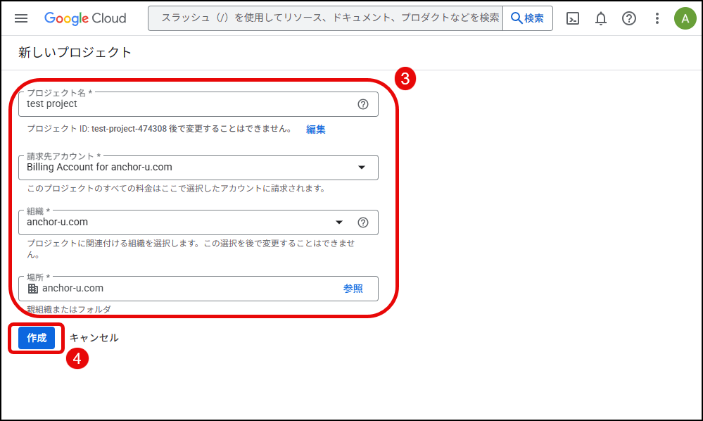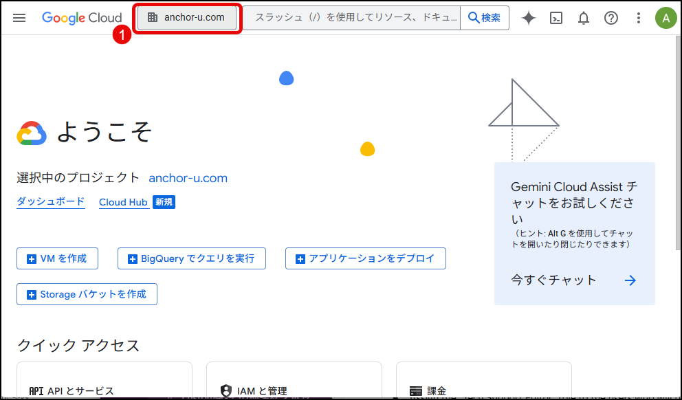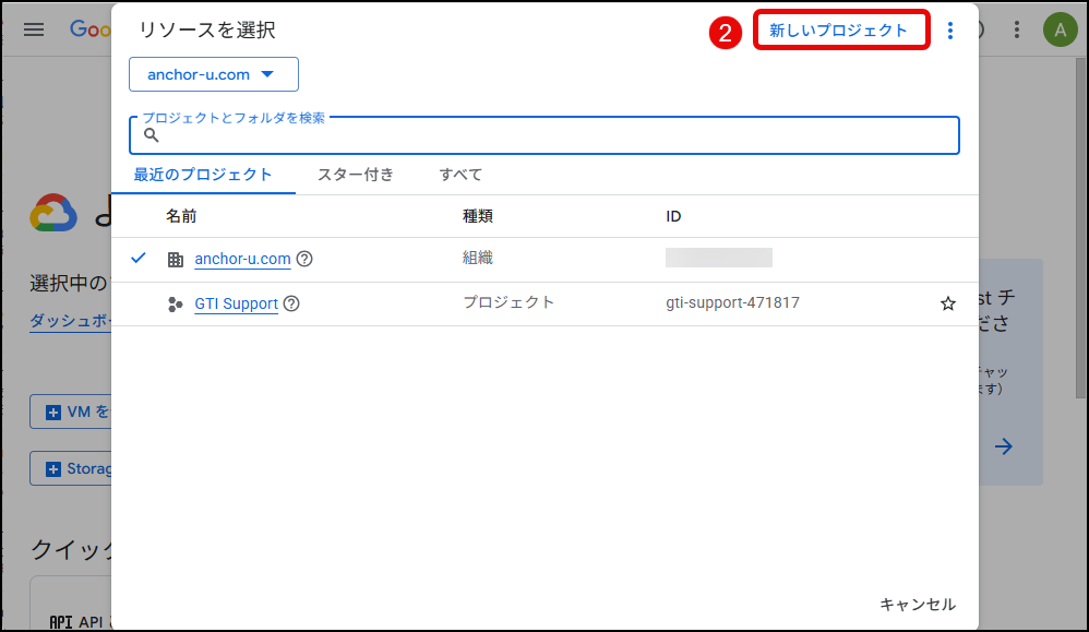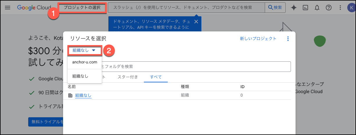 - お使いのGoogleアカウントがある場合は、そのGoogleアカウントにて Google Cloud Platform にログインし、「プロジェクトの選択」をクリックし、表示されるポップアップ画面の中で「組織なし」をクリックします。「組織なし」以外の選択肢が表示される場合(下図の場合、「anchor-u.com」)は、すでに組織が存在します。