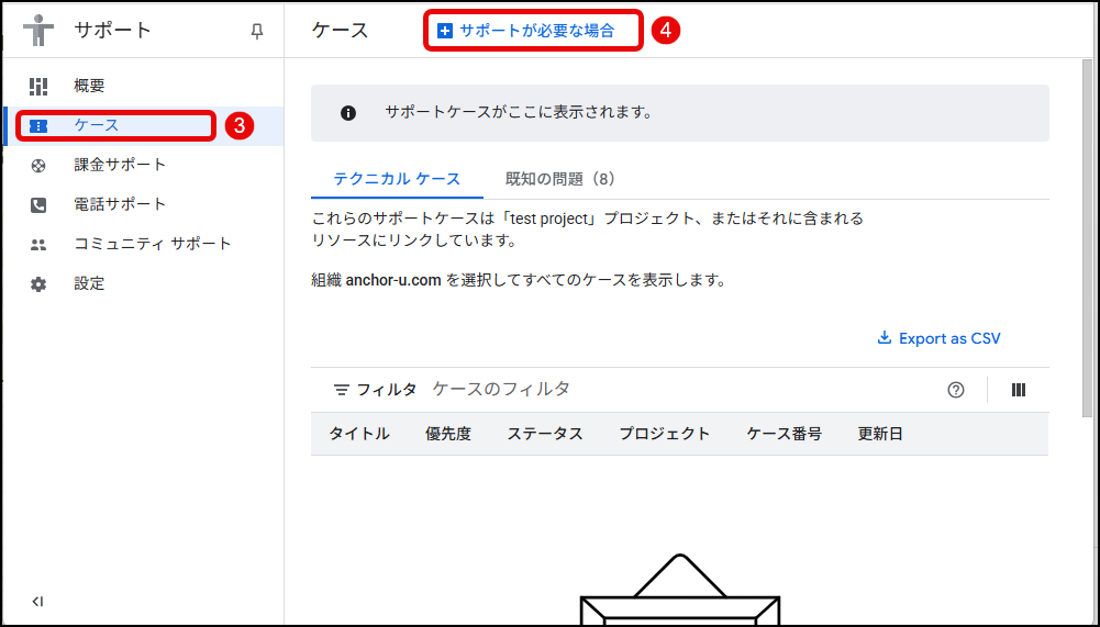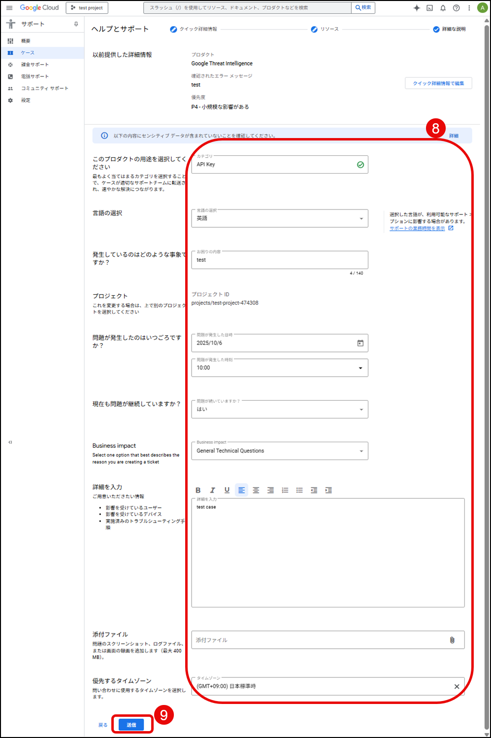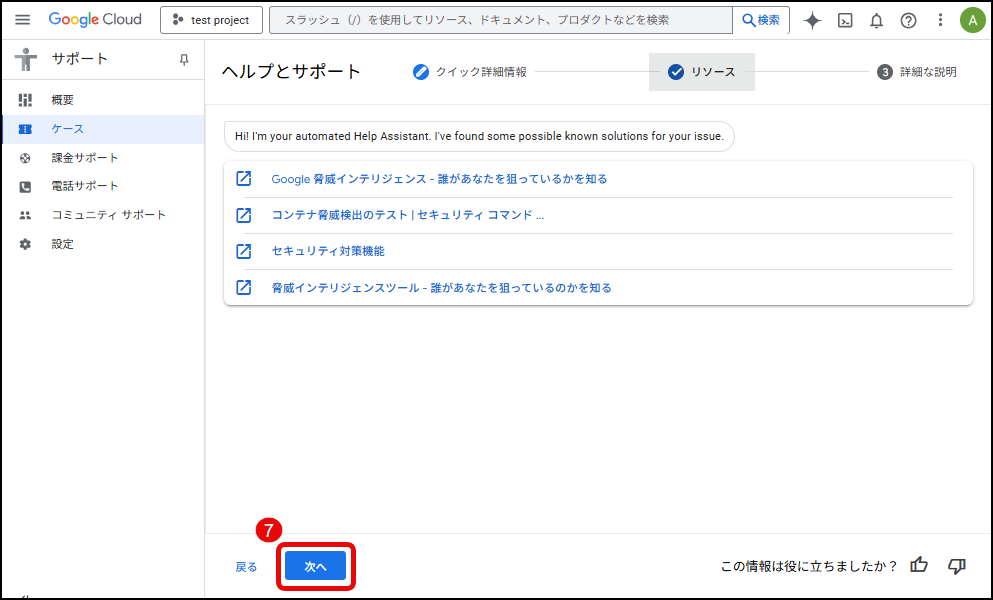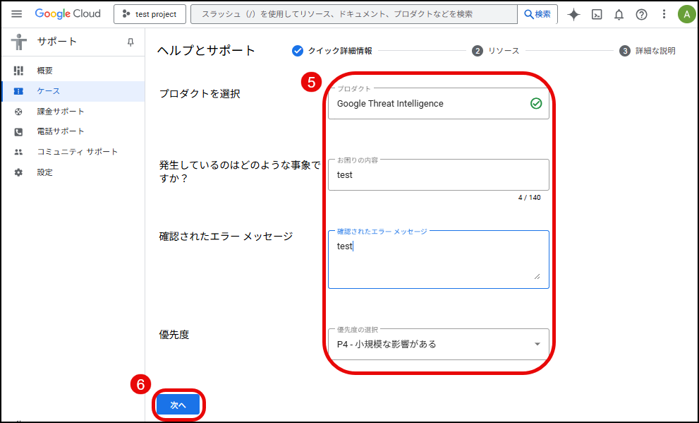 弊社へ組織IDをご連絡いただいた日から2営業日以上経ちましたら、すべてが正しく動作していることを確認するためにテストケースを提出することをお勧めします。「テクニカルサポート編集者」のロールを持つユーザーとして Google Cloud Console のサポートページにサインインし、テストサポートケースを作成したい GTI プロジェクトを選択の上、以下のキャプチャの手順にてテストケースを提出できます。