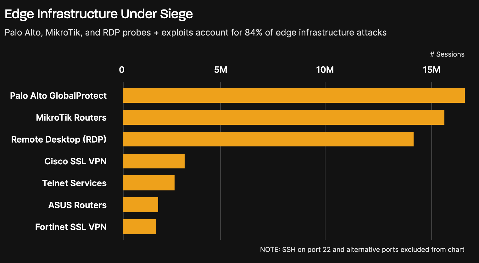 Palo Alto GlobalProtect、MikroTikルーター、RDPの3カテゴリだけで、SSH以外のエッジインフラ攻撃の84%を占めています。エンタープライズVPN全体で約2,100万件、ルーターで1,750万件超、RDPで1,420万件が観測されました。