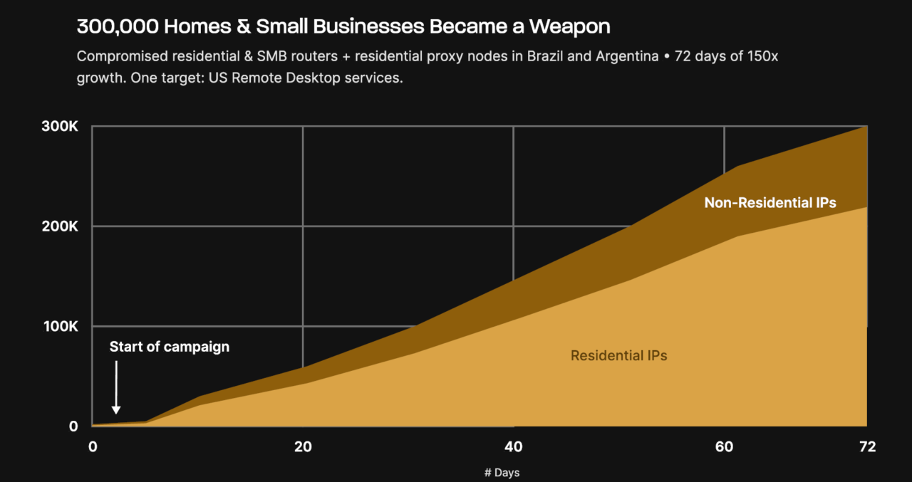 2025年8月から観測された米国のリモートデスクトップサービスを狙う認証情報スプレー攻撃では、ブラジルやアルゼンチンのルーターやレジデンシャルプロキシノードを踏み台にしたボットネットが使用されました。この攻撃に参加したIPアドレスは、わずか72日間で2,000件から30万件へと150倍に拡大しました。さらに、参加IPの73%は過去に悪性活動の履歴がない一般家庭の回線でした。