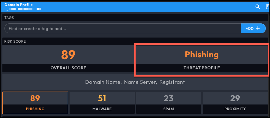 DomainToolsは各ドメインに対してリスクスコアを付与し、脅威の可能性を予測します。この脅威スコアに基づき、ドメインがフィッシングやマルウェアに関連しているかどうかを素早く判断でき、企業は早期に防御対策を講じることができます。