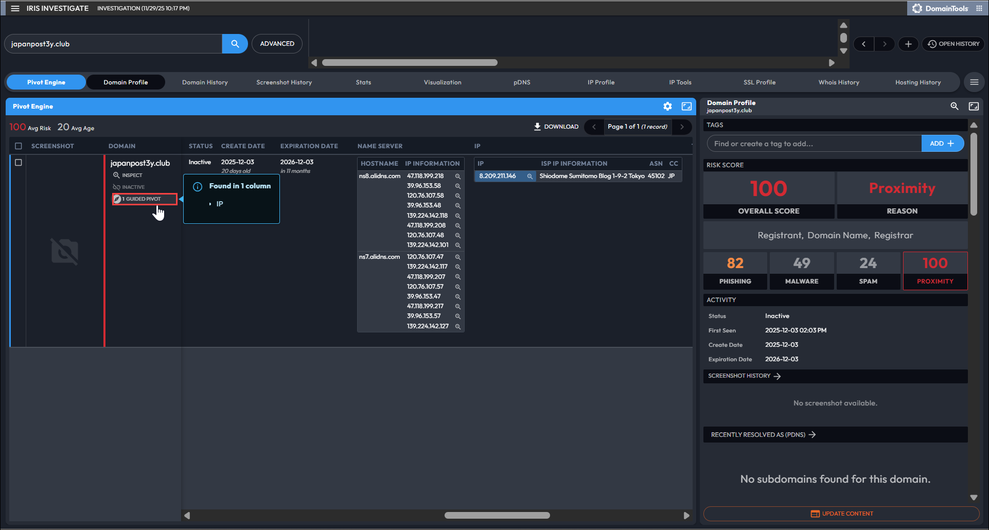 次の調査の起点となる、ドメイン間で共通する属性(IP、Whois、SSL など)が「GUIDED PIVOT」 として表示され、該当する情報が画面上でハイライトされます。