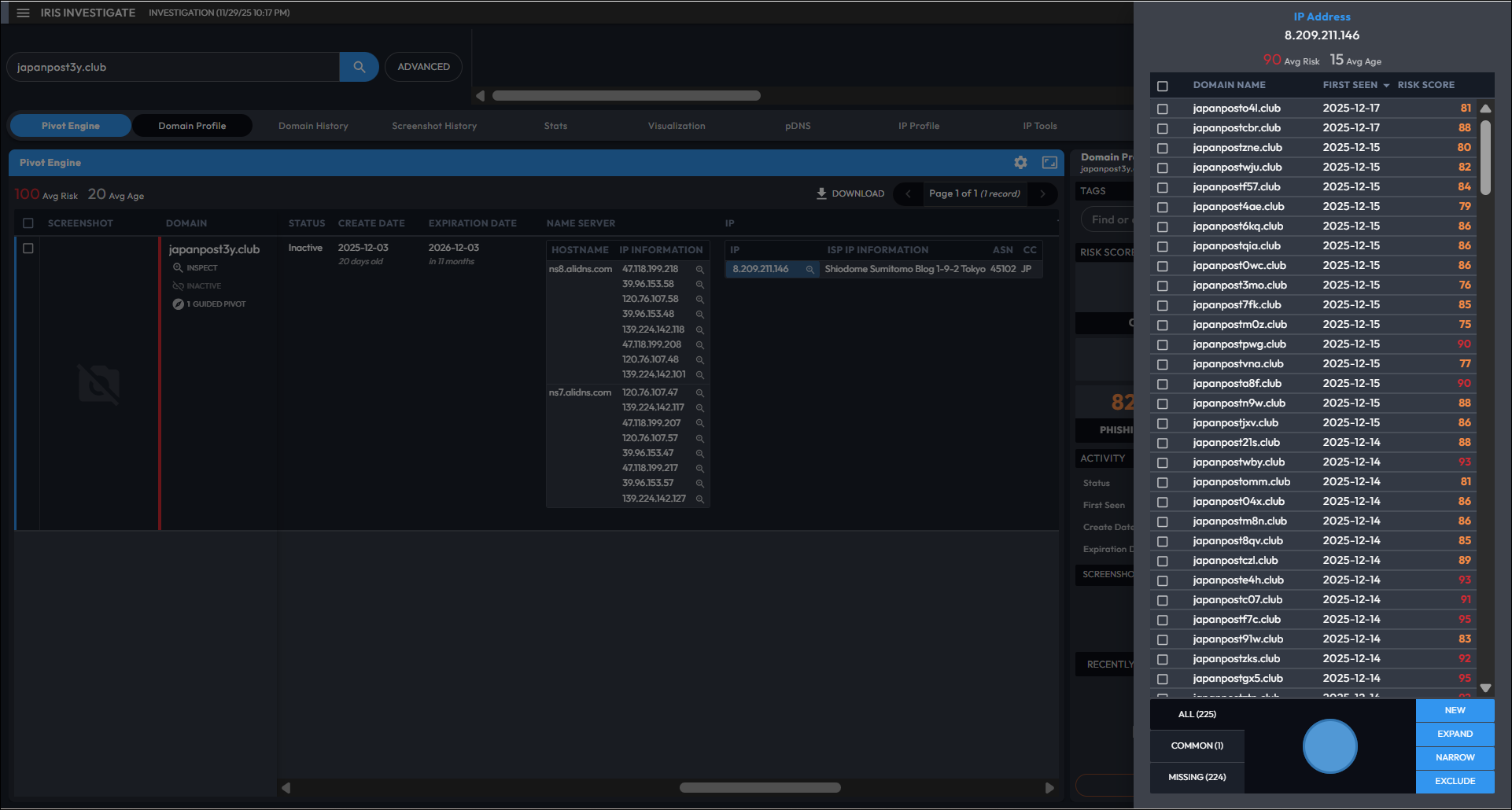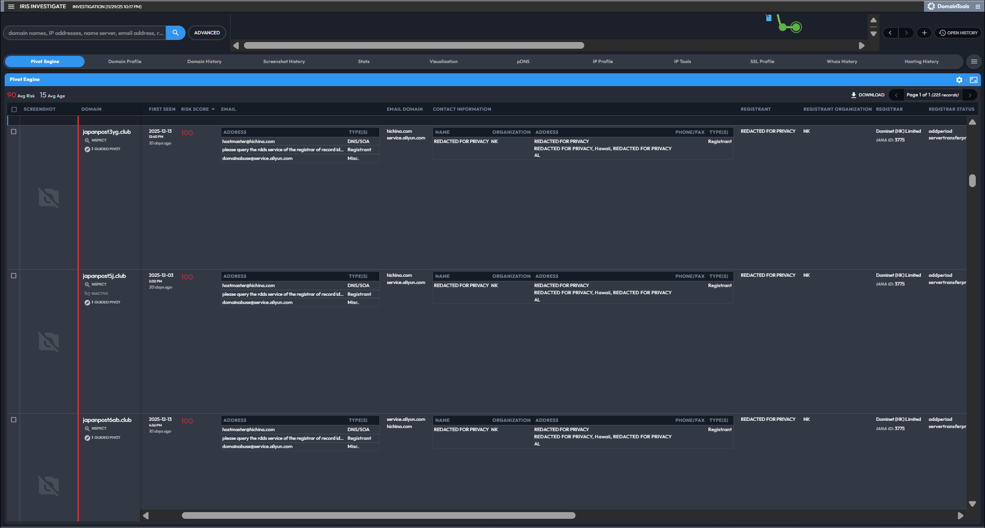 Irisは、脅威インテリジェンスプラットフォーム群であり、複数のツールを提供しています。- Iris Investigate:脅威アクターのネットワークをマッピングするツール。リスクスコアをはじめとする、ドメイン関連の脅威に関する詳細なインサイトを提供します。ウェブインターフェースとAPI、両方で利用可能です。Iris Enrichと比べると、1つ1つのドメインおよびそれに関連する攻撃インフラを詳細に深掘りするような調査に適しています。