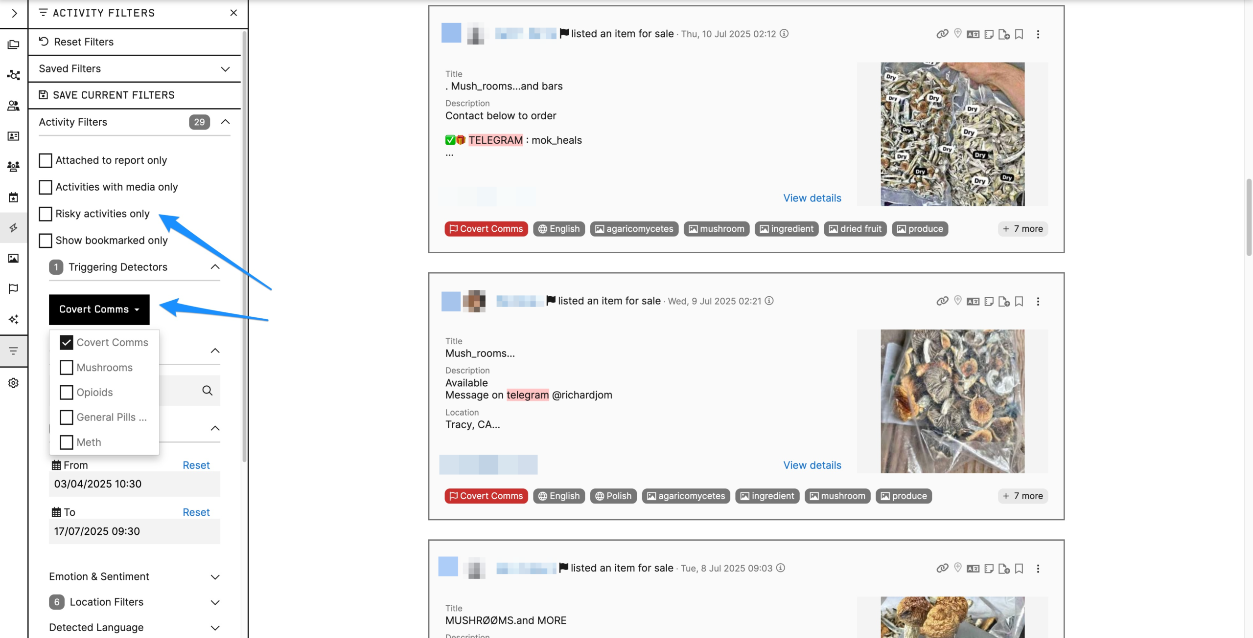 Fivecast ONYXの最大の特徴は、収集したデータをユーザー専用の環境にコピーして保存する点です。調査対象者が投稿を削除したり、アカウントを非公開(鍵付き)に変更したり、プラットフォーム側によってアカウントが凍結されたりした場合でも、一度収集したデータは失われません。これにより、証拠隠滅のリスクを防ぎ、確実な調査記録を保持することが可能です。 - 高度なAIリスク検出とマルチメディア解析